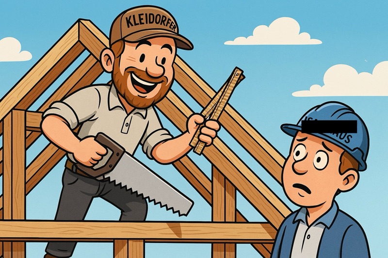 Manchmal fragt man sich auf einer Baustelle ja, ob es überhaupt noch Menschen gibt, die ihr Handwerk beherrschen. Nach vielen Monaten mit Pleiten, Pech und Paragraphen, nach jeder Menge Baustellen-Kabarett und Mängeln zum An-die-Wand-Nageln, kam er dann doch noch – der Hoffnungsträger mit Säge, Maßband und Verstand: die Zimmerei Kleidorfer (https://www.zimmerei-kleidorfer.net).