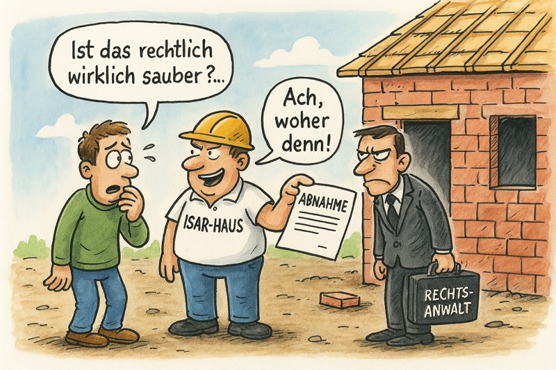 Eine Abnahme kann man nicht einfach behaupten. Auch wenn die Mitarbeiter von Isar-Haus uns VOR unserer Rechtsanwältin zu einer Unterschrift zur Abnahme quasi drängen, ja sogar nötigen wollten…