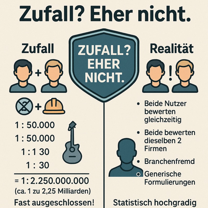 “Die auffällige zeitliche und inhaltliche Parallelität mehrerer neuer positiver Bewertungen für zwei unabhängige Firmen durch verschiedene Nutzer lässt erhebliche Zweifel an der Echtheit der Rezensionen entstehen. Die Eintrittswahrscheinlichkeit eines rein zufälligen Zustandekommens ist rechnerisch als vernachlässigbar gering anzusehen.”