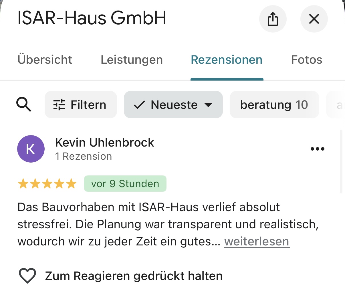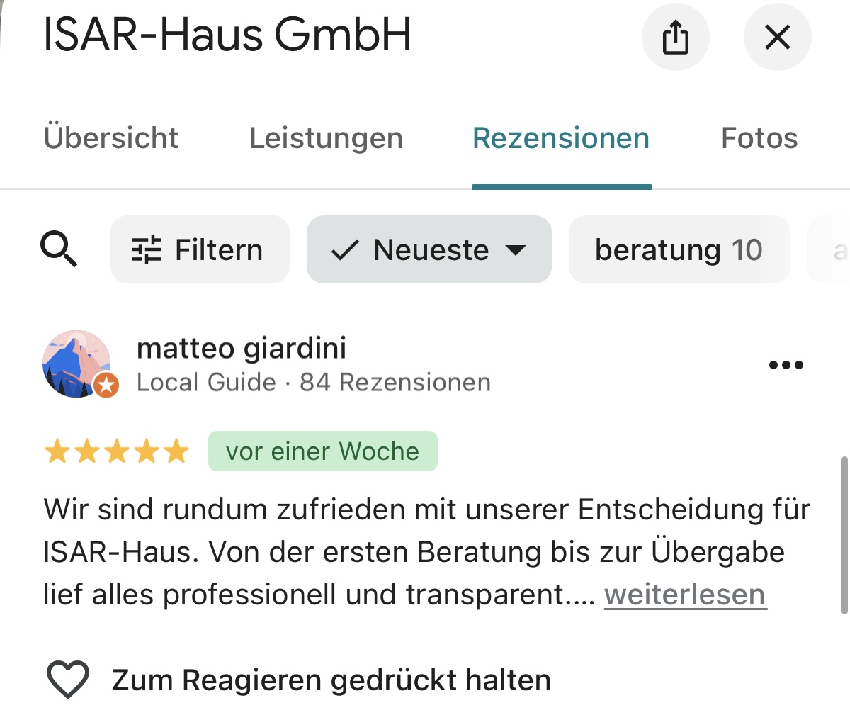 Auf Google Maps erschienen kürzlich mehrere neue, sehr positive Rezensionen für die Isar-Haus GmbH.